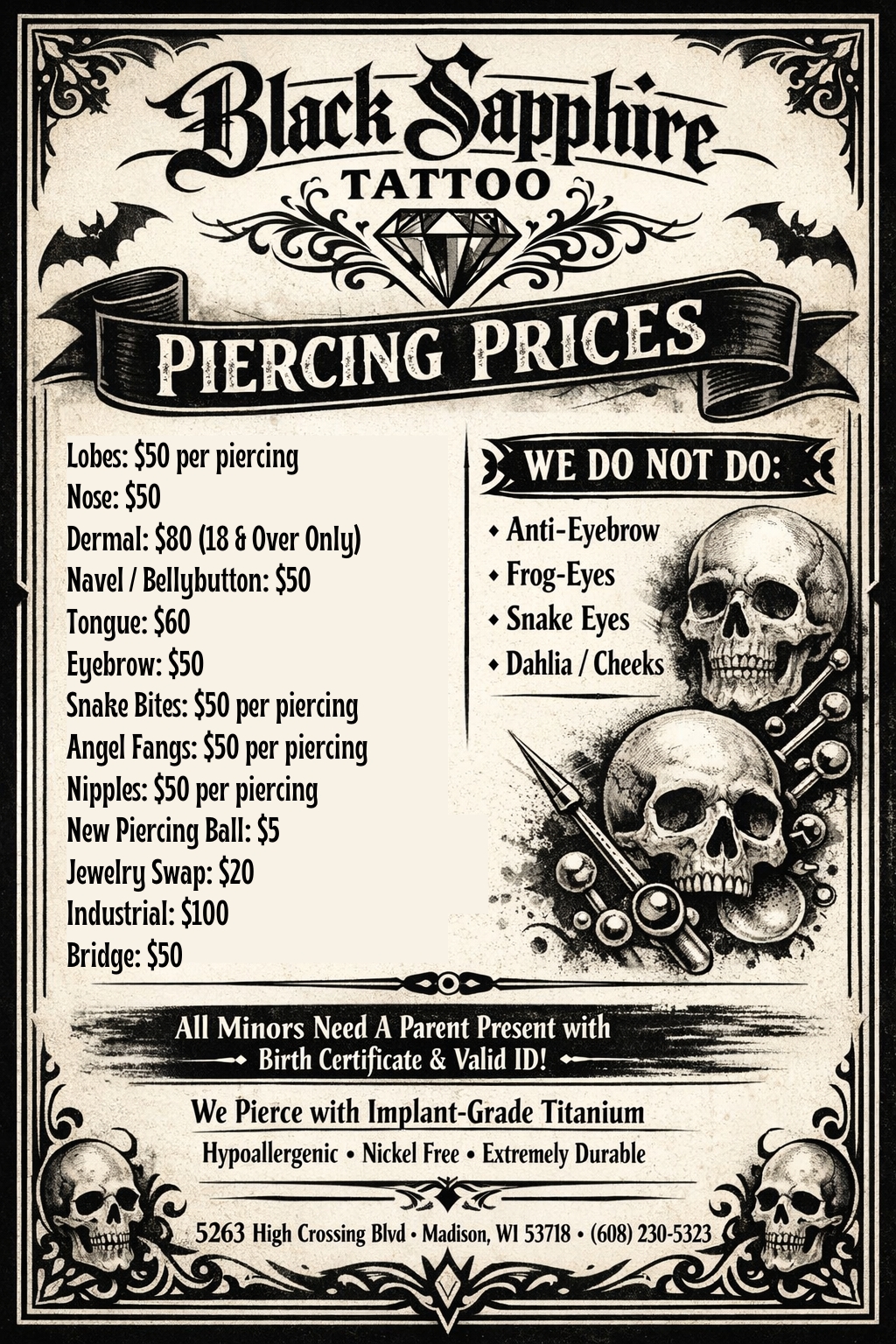 Welcome to Black Sapphire Tattoo, Madison, WI's premier tattoo shop since 2019! We specialize in tattoos and piercings, with an emphasis on artistry, quality, and safety. Our talented artists are ready to help you complete your look with our top-tier body jewelry and custom design options. Whether you desire a small, meaningful tattoo or a statement piece, we use only the finest materials for every creation. Serving the Madison, Janesville, and Sun Prairie areas, we're excited to continue our journey of providing exceptional tattoos and body art to our community. Visit us today to consult with our professional artists!